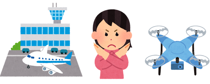 航空法はドローンの飛行に場所に一定の制限をしています。有人の航空機に衝突する恐れや落下した場合に地上の人などに危害を及ぼす恐れのが高い空域として、「空港等の周辺の上空の空域」と「高度150m以上の高さの空域」においてドローンを飛ばす事を禁止しています。