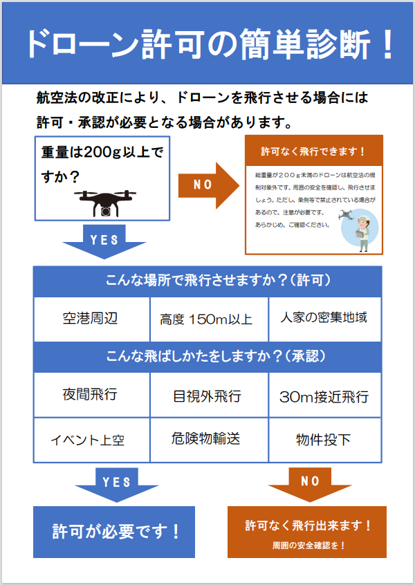 ドローンとは、無人航空機の一種です。ドローン(無人航空機)を飛ばす際に必要な手続きは、大きく分けて2つあります。それは「許可と承認」です。簡単にいうと、許可とは空域に関する制度であり、承認とは飛行のさせ方に関する制度になります。ドローンを飛ばす前に、許可・承認が必要かどうか、簡単診断してみましょう!